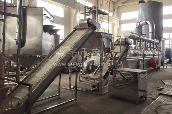 物料自進料口進入機內,在振動力作用下,物料沿水平流化床拋擲,向前連續(xù)運動,熱風向上穿過流化床同濕物料換熱后,濕空氣經旋風分離器除塵后由排風口排出,干燥物料由排料口排出。